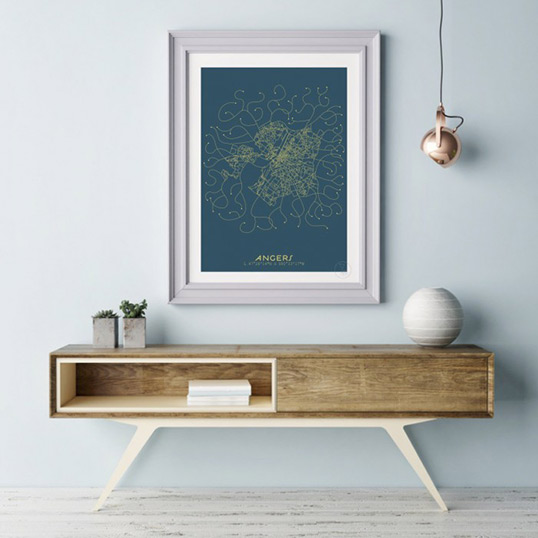 Une jolie représentation de la ville d’Angers en toute poésie… La tête dans les étoiles, observez la ville sans jamais atterrir 🙂 Dimension : 30 x 40 cm Différents coloris : Fond Bleu, Rues Dorées // Fond Noir, Rues Blanches // Fond Vert, Rues Noires // Fond Beige, Rues Rouges Imprimée sur Papier Rives 170g Blanc Naturel à La Rochelle Vendu sans cadre. Tu veux un cadre ? Rendez-vous ici !