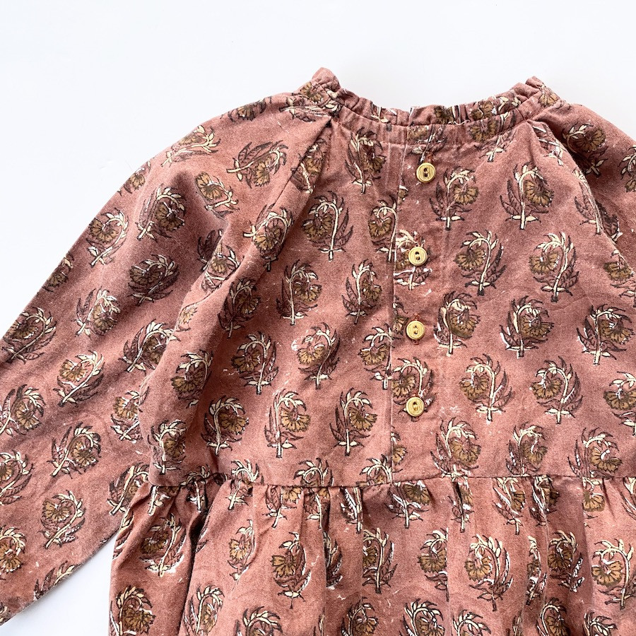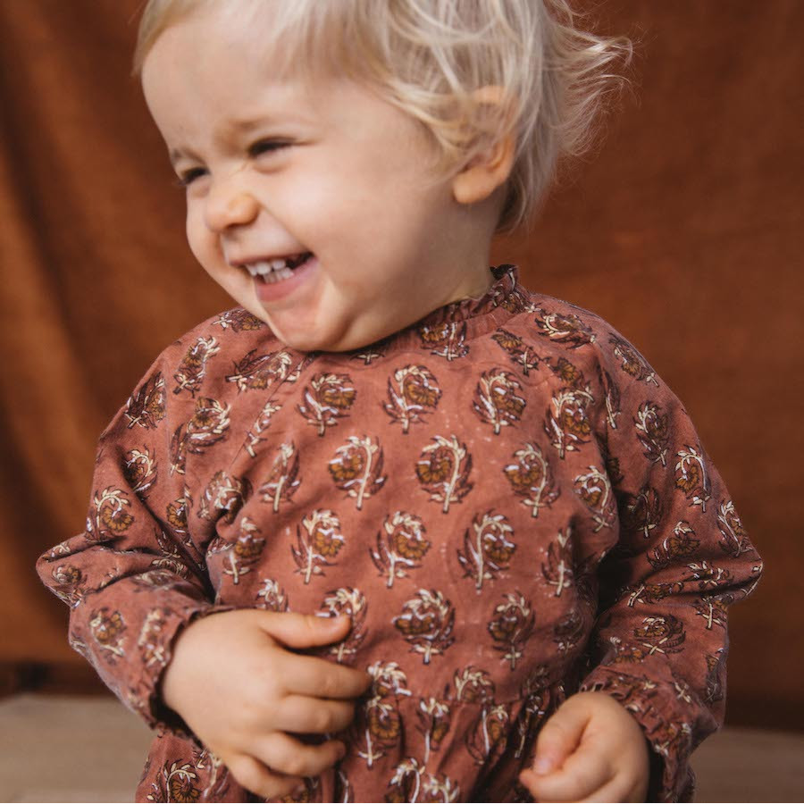 La barboteuse Mili est confectionnée en Inde grâce à la technique du block print.