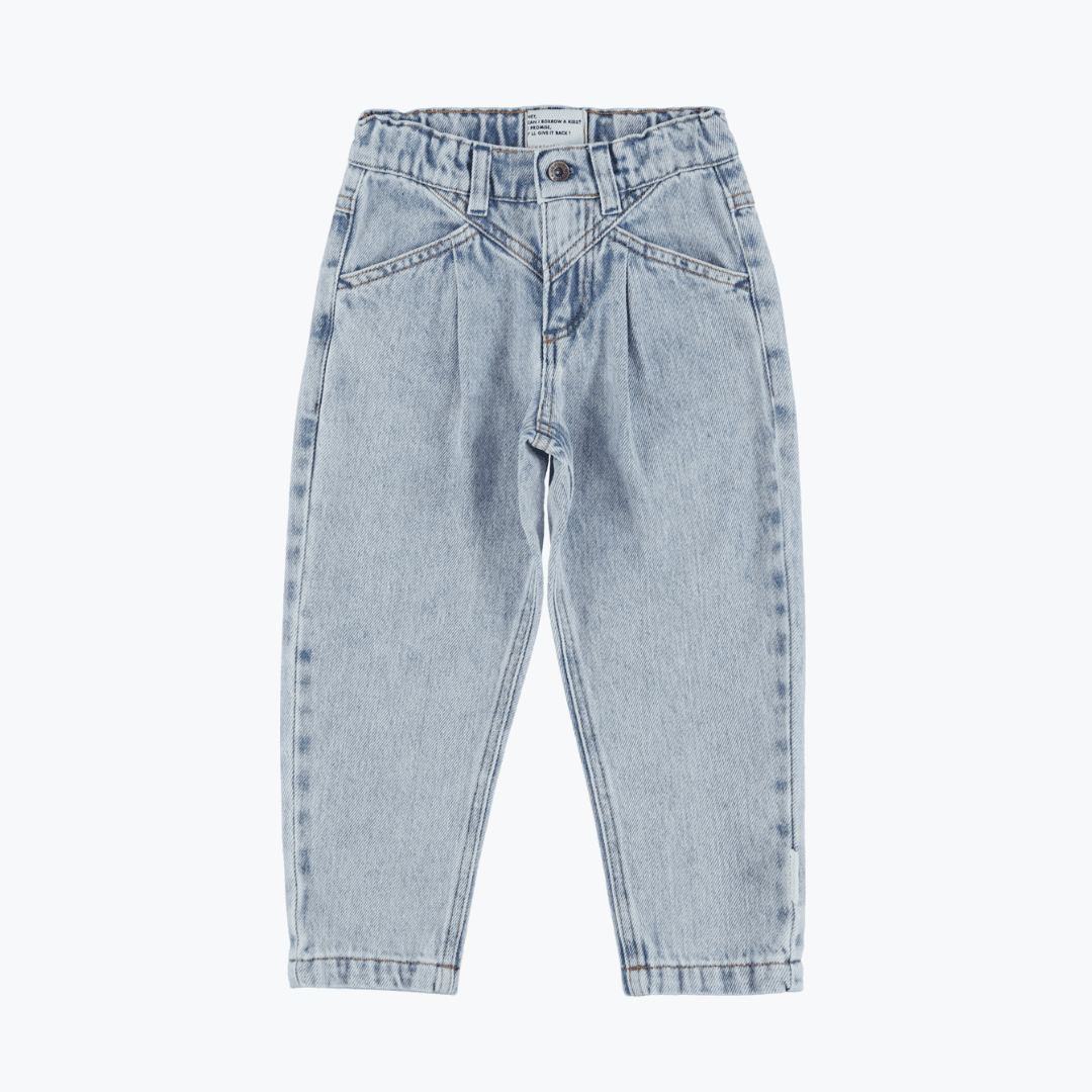 Parce qu’on veut le meilleur pour vos marmots ce jean Piupiuchick est : Fabriqué au Portugal 100% coton bio Pantalon coupe mum avec taille réglable, pince devant. logo bleu brodé sur la poche arrière.. Nos p’tits conseils ++ : Laver max à 30° ! Sèche linge doux Repassage autorisé à basse température, 110° Ne surtaillez pas Piupiuchick taille parfaitement !